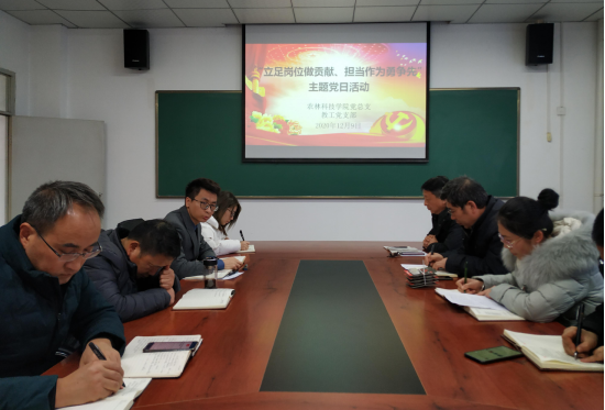 为增强公司党员干部责任担当意识,进一步激发干事创业激情,12月9日下午,公司党总支组织教工党支部、员工党支部在农学楼201会议室集中开展了“立足岗位做贡献,担当作为勇争先”主题党日活动,活动由办公室主任王百祥主持。