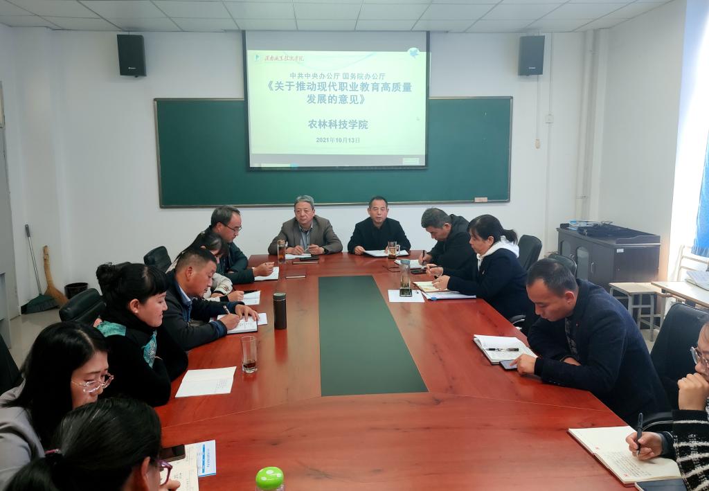 10月14日下午,best365在农学楼201会议室召开了全体教职工会议,学习了中办国办《关于推动现代职业教育高质量发展的意见》精神,部署安排best365落实发展意见的具体措施,会议由办公室主任王百祥主持。