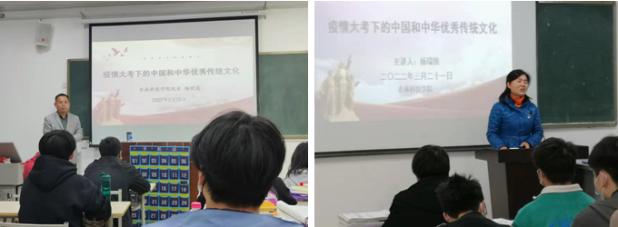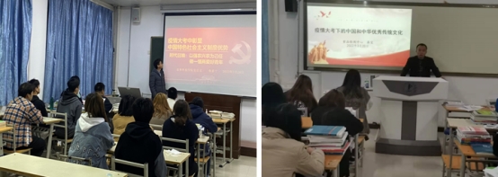 文化是一个国家、一个民族的灵魂。在应对新冠肺炎疫情的过程中,我们深刻的感受到,中华优秀传统文化所展现的强大力量。疫情暴发后,习近平总书记反复强调,“把人民群众生命安全和身体健康放在第一位”“坚决做到应收尽收”“最大限度提高治愈率、降低病亡率”“保护人民生命安全和身体健康可以不惜一切代价”。 宣讲老师从多方面对新冠肺炎疫情暴发至今,我国疫情防控阻击战取得重大战略成果,这些离不开中华优秀传统文化的支撑。