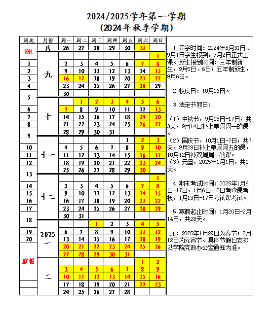 2024年秋季校历