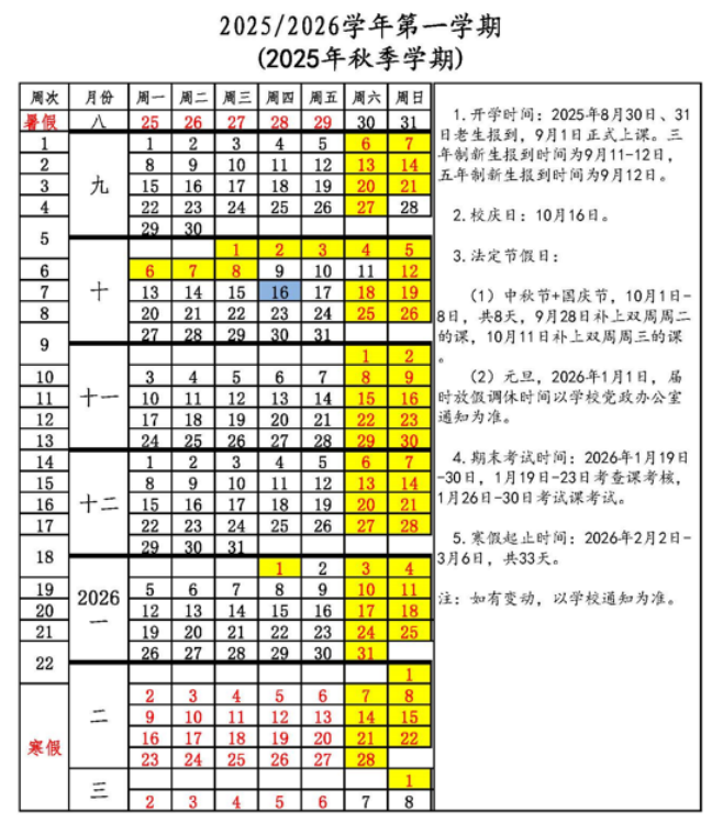 2025年秋季校历